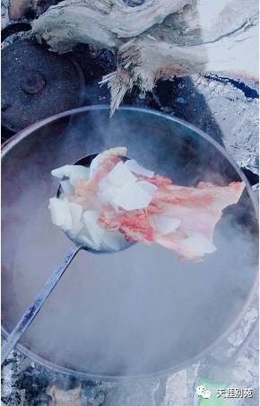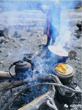 载我到达目的地之后,司机大哥叫了他的队友下去接我的小伙伴们,我也了解到有8辆摩托车,每天会来回跑很多次,骑车车的人都是当地技术非常好的。在等待小伙伴的过程中,我又和当地烤石板烧烤的阿姐聊了起来。喜欢他们这种不添加任何防腐剂和色素的食材,一切都是原滋原味。一个河滩地,一个个简单的土灶,加上一个石板,刷上油,就能放上肉再上面烤着,隔壁炖着山里捡来的蘑菇炖大骨和腊肉,为了配合众人的口味,也用地里的白萝卜炖了一锅汤,隔壁的石板上还烤着红薯和土豆,阵阵香味飘来。